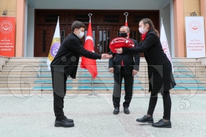 Öğrenci Sibel Sarıaydın, “Sevgili Kardeşim, rengini atalarımızın kanlarından almış bu şanlı bayrak, ulusumuzun bağımsızlık sembolüdür. Temsil edildiği her yerde bu kahraman ulusun gurur kaynağı olmuştur. O’nu teslim aldığım andan bu ana kadar gururla taşıdım. Sizin de bu kutsal emaneti koruyup yüceltece ğinize inanıyor, aldığım gibi öperek size teslim ediyorum” dedi.